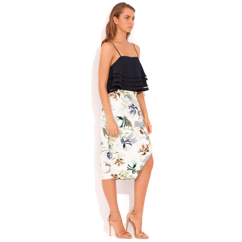 It’s fitted silhouette hugs the body perfectly, the Now & Later skirt is cut from an exclusive oversized floral print and details an asymmetric hem.